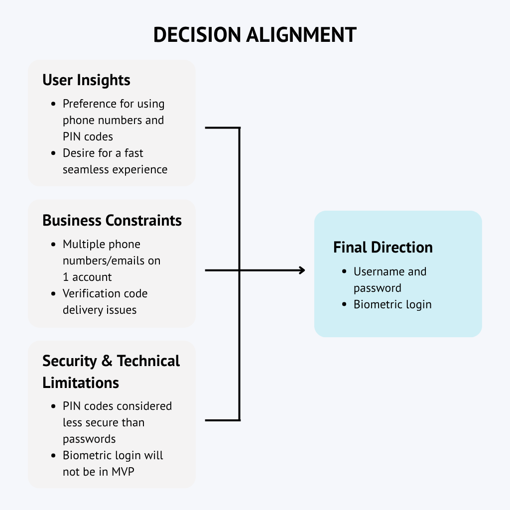 After testing the initial login flows, the results clearly favored phone number + PIN authentication. However, presenting these findings to stakeholders revealed broader system and security considerations. The design process evolved from here, balancing what users found intuitive with what the business could securely support.