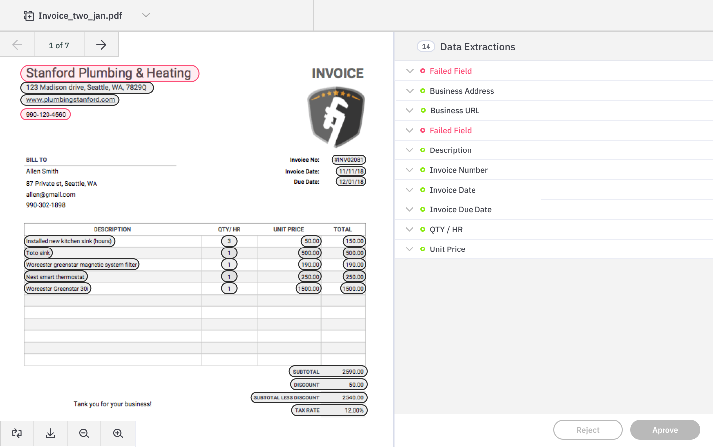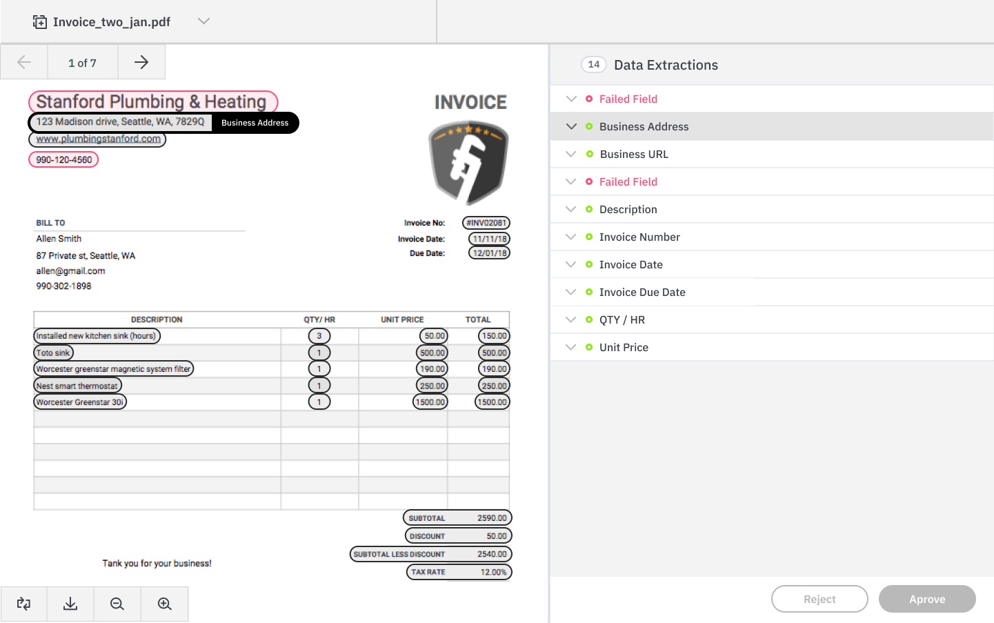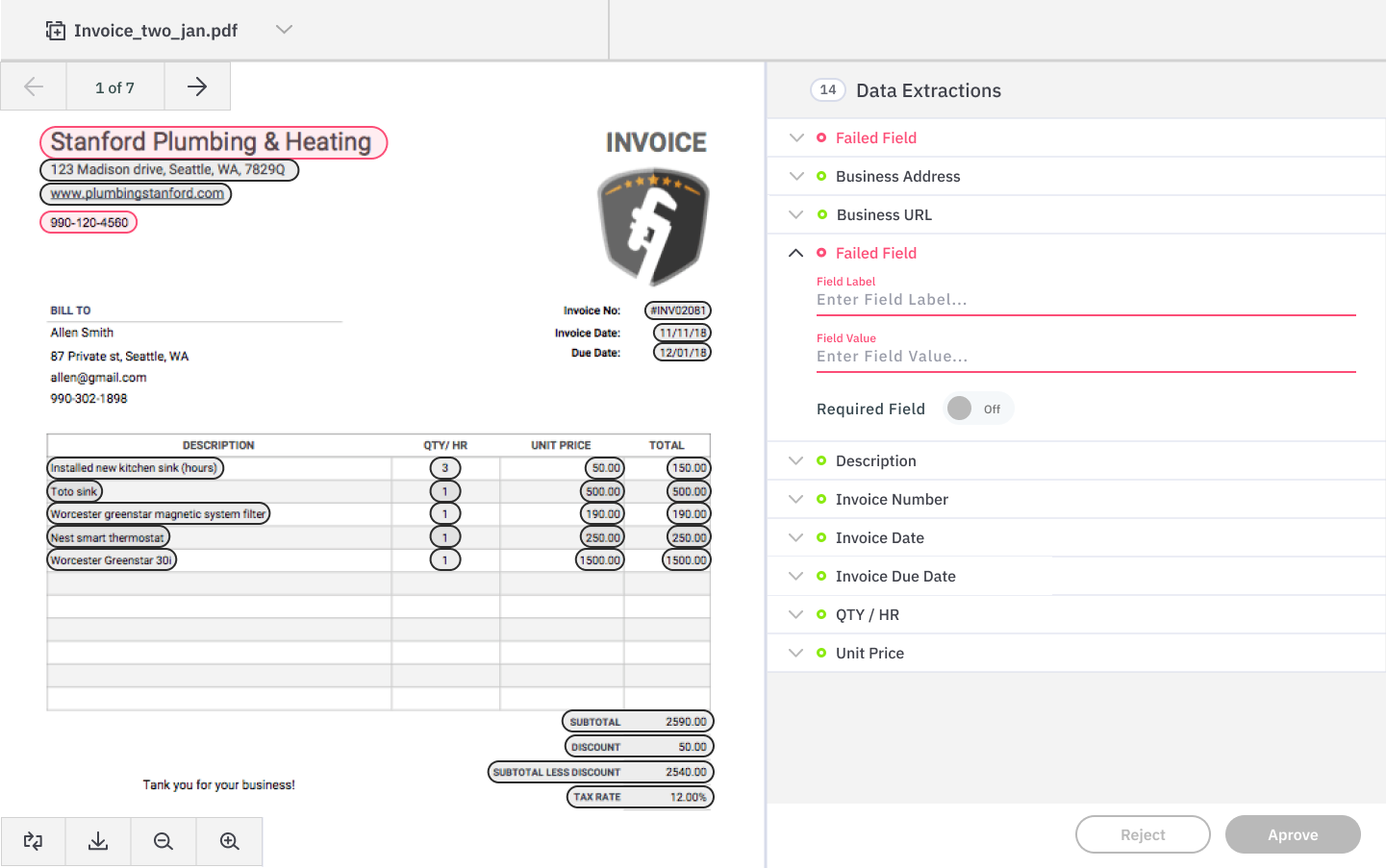 Solution: Allow users to click directly on values within the document to auto-expand the corresponding field in the validation panel. - Manual Input for Unrecognized Data